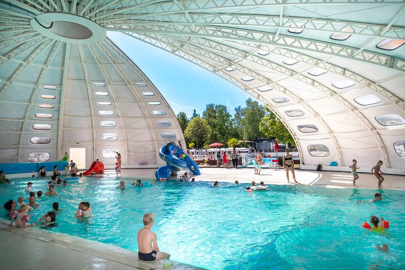 Het is groot, geel, iconisch en niet te missen, het zwembad op camping hu Birkelt Village is de grote trekpleister van de camping en favoriet bij heel veel kinderen. Maar wist je dat er een bijzonder verhaal zit achter de koepel van het overdekte deel van het zwembad?